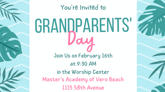 Grandparents are special to us! We wish to honor you on the morning of February 16th and give you a look into what Master's Academy is all about. Join us for chapel, then visit your grandchild's classroom. We hope to see you on Grandparents' Day!